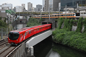 手前の丸ノ内線の赤から中央線のオレンジ、そして総武線の黄へと、