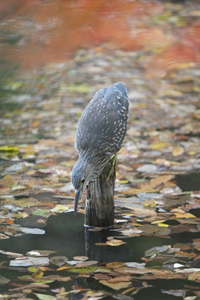 色づいたイロハモミジの下にいるのは、ゴイサギの幼鳥です。