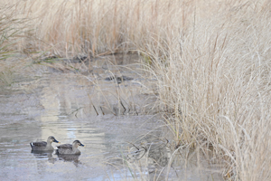 この池には、身を隠すのに適したヨシやマコモが生えていても、