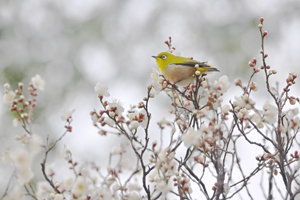 その目を盗んで、メジロが花の蜜を舐めていました。